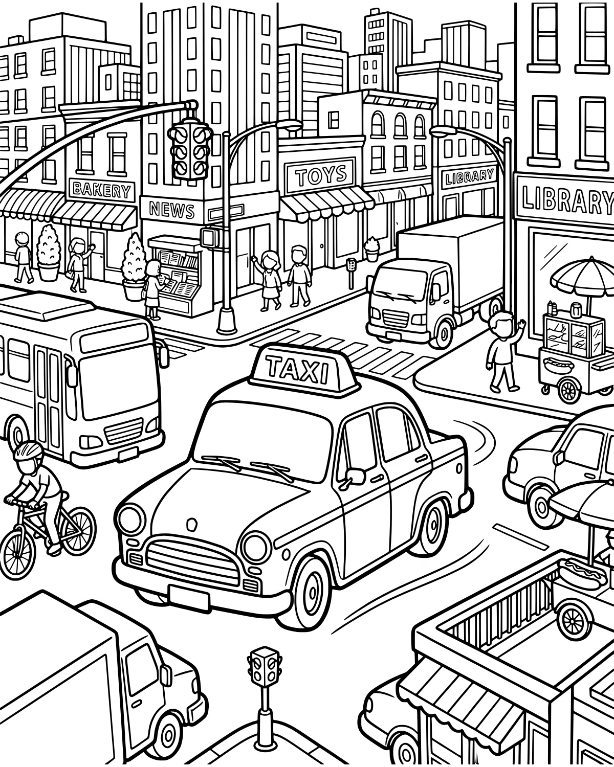 It is an excellent choice for anyone who loves the excitement of a big city. From the yellow taxi weaving through traffic to the friendly shop windows, there is so much to see and color. Each part of the image tells a small story about life in a busy neighborhood.
