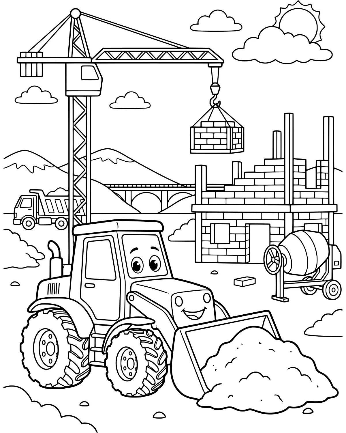 As you look across the site, you will find a variety of hardworking vehicles. A large tractor sits in the foreground with its bucket lowered toward the ground. Nearby, a cement mixer and a dump truck are parked near the building's sturdy pillars and half-finished walls. The crane stands tall, reaching toward the sky to help the builders. In the distance, a long bridge stretches across the horizon, while majestic mountains and a smiling sun complete the background. Every corner of the page has something new to discover, from individual bricks to the tiny details on the truck wheels. You can follow the lines of the bridge or the curves of the clouds as you fill in this industrious scene.